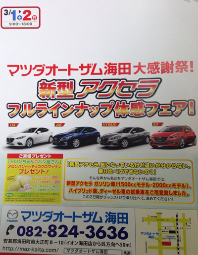 さて、来たる 3/1〜2 にマツダオートザム海田にて大感謝祭を開催させて頂きます。