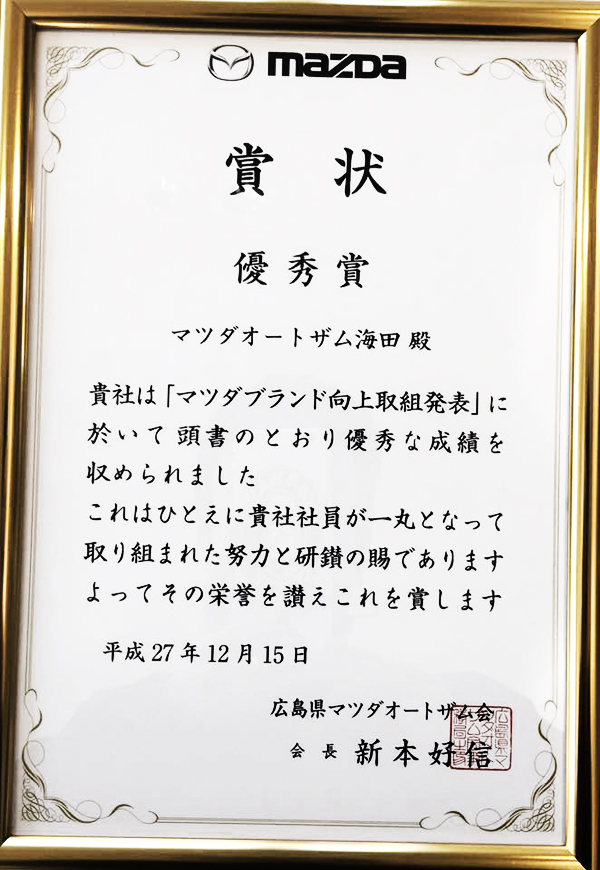 12月15日に行われたマツダオートザムの懇親会においてマツダのブランド力向上にあたり店舗で取り組んでいる内容を発表させて頂き見事、優秀賞を受賞させて頂きました。これも店長はじめ店舗全体で取り組んだ結果だと思います!