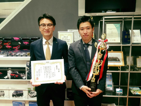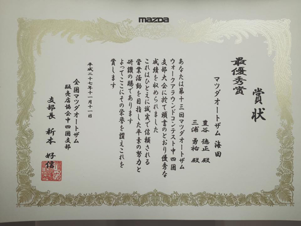 10/7 に行われたマツダウォークアラウンドコンテスト県大会にて我が海田チームの豊谷主任と三浦君が見事、敢闘賞を受賞致しました。11月の支部大会に向けてまだまだ気をぬけません。明日からチーム一丸で頑張ってまいります。
